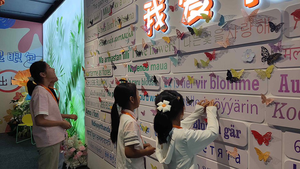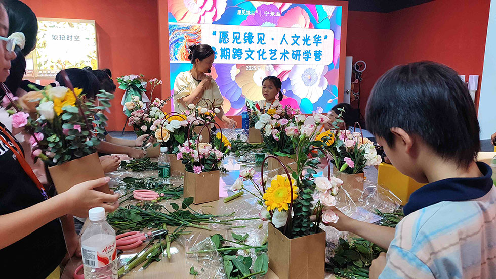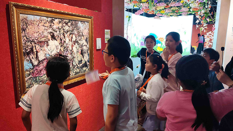 活动依托正在展出的“愿见缘见”跨文化艺术交汇展,构建“展览+实践”的创新美育模式。在专业导览团队引领下,6-12岁营员们开启“跨文化艺术探秘”之旅。围绕“墨彩绘花语”主题,通过“大语文”视角对97幅全球名画1:1复刻作品进行深度解读,将中外花语知识、人文典故、诗词意象、花艺装置、数字艺术和艺术史脉络相结合,在抢答互动中激活青少年的艺术感知力。现场童声笑语与思维碰撞交织,有效弥补了学校艺术实践的短板。